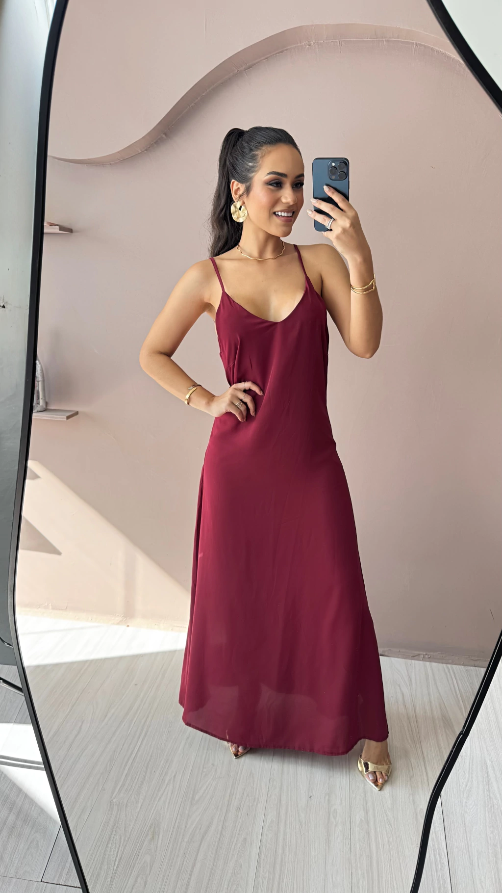 Vestido em tecido de crepe de tule forrado com alça com regulagem