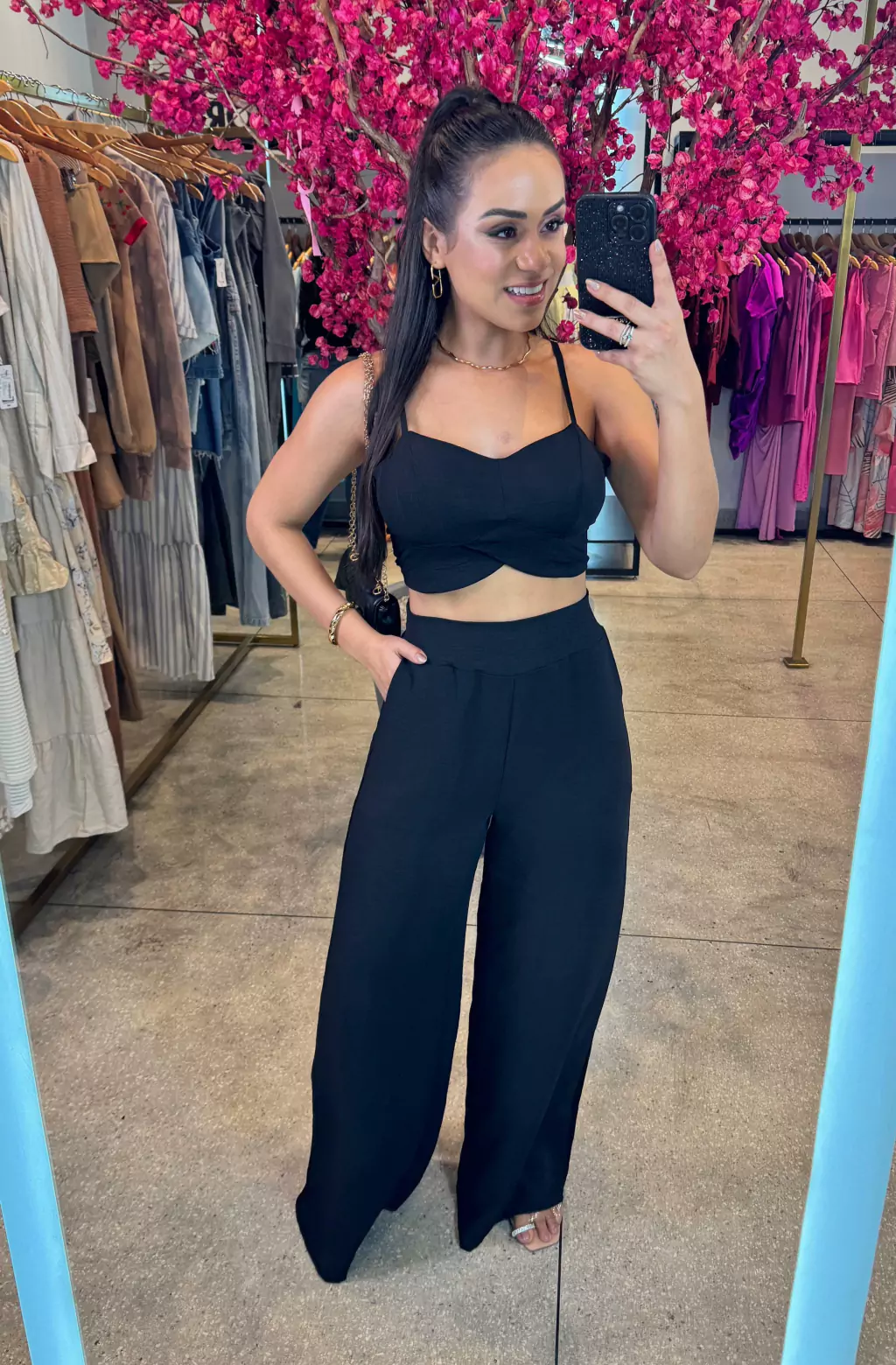 Conjunto em tecido duna cropped com bojo calça com elástico veste do 36 ao 42