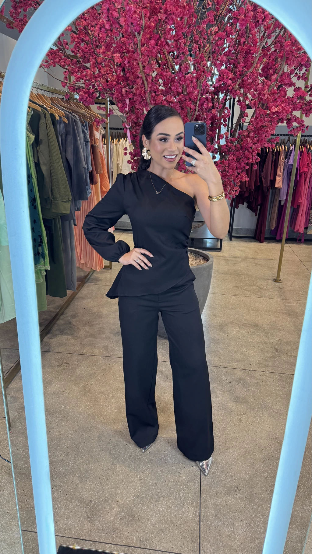 Conjunto em tecido alfaiataria Barbie com zíper lateral na blusa.