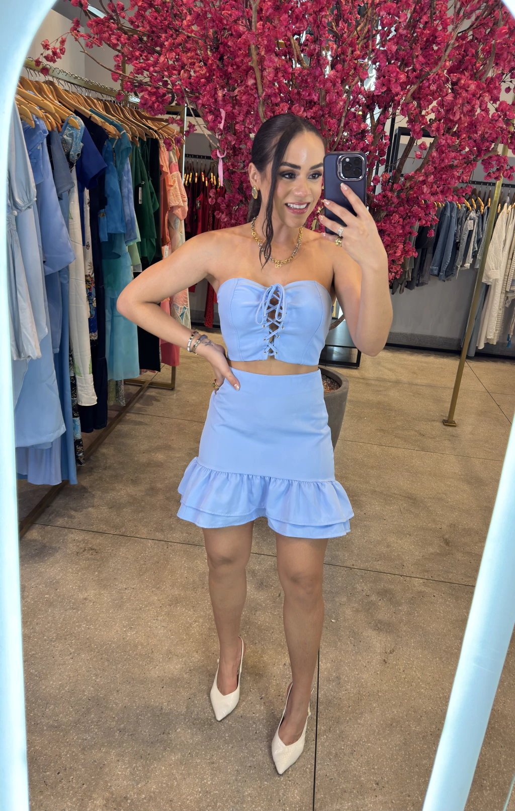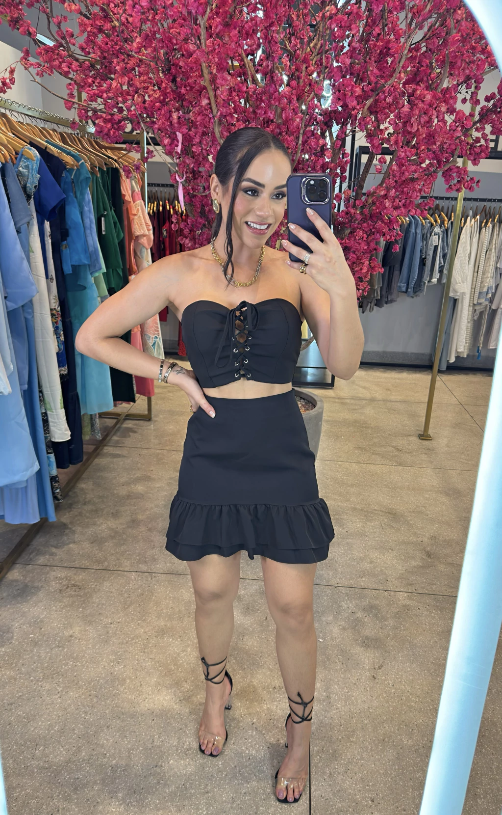 Conjunto em alfaiataria com Corselet amarração saia com comprimento atrás maior.