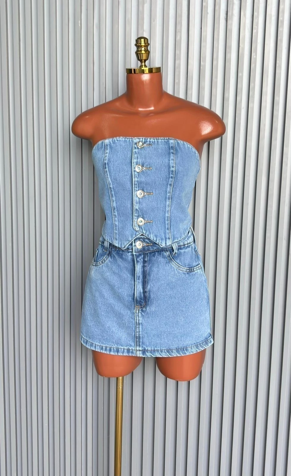 Conjunto jeans com elástico nas costas botões no cropped short saia.
