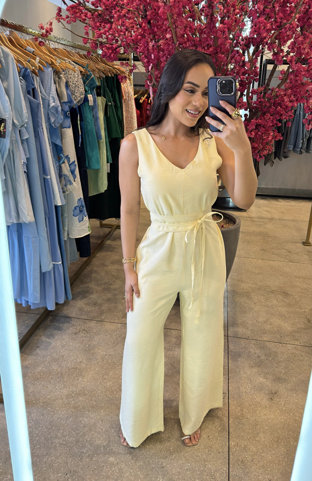 Macacão pantalona alfaiataria marrant acompanha o cinto.
