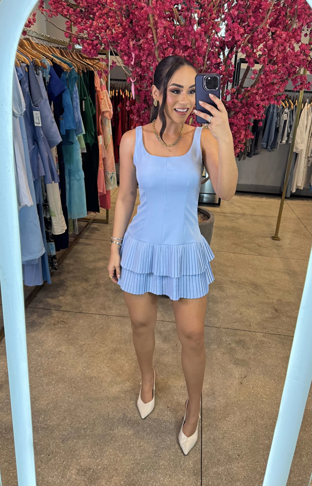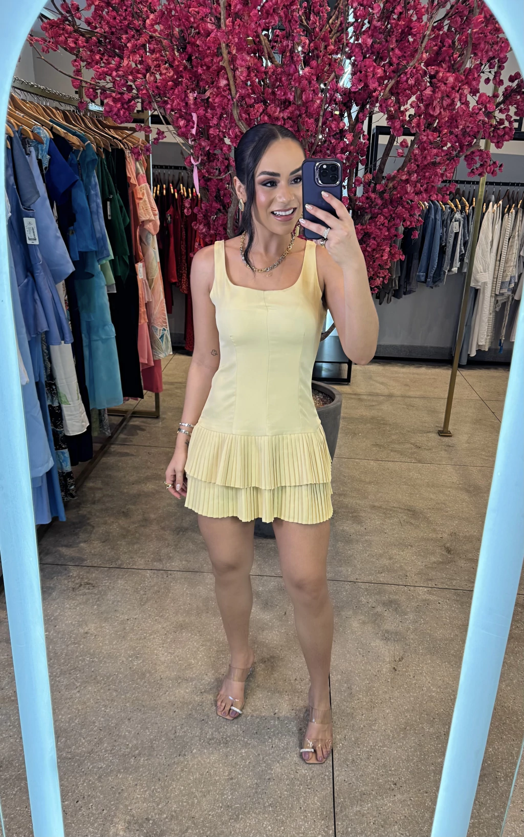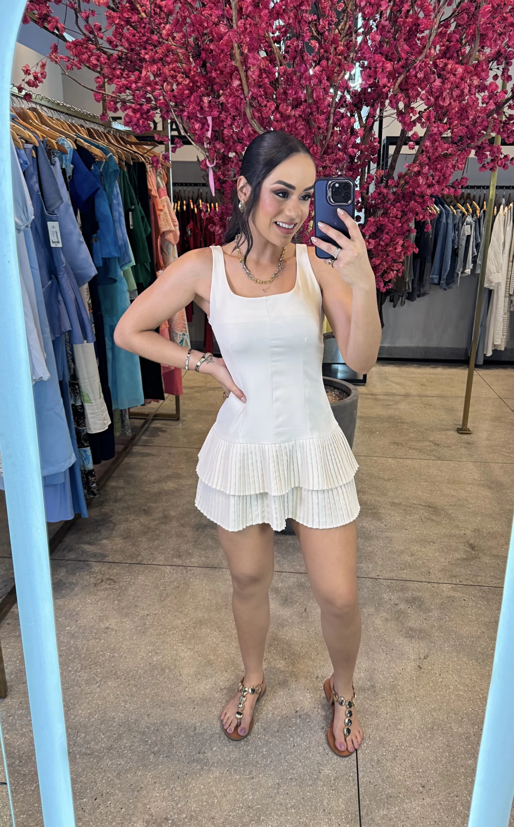 Vestido em tecido alfaiataria plissado com zíper na lateral.