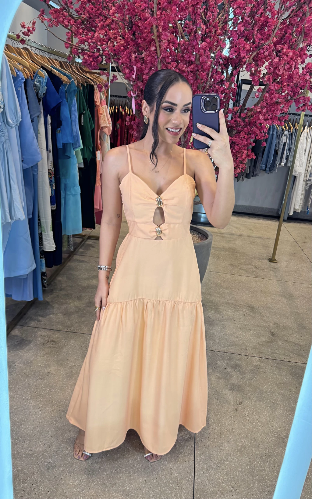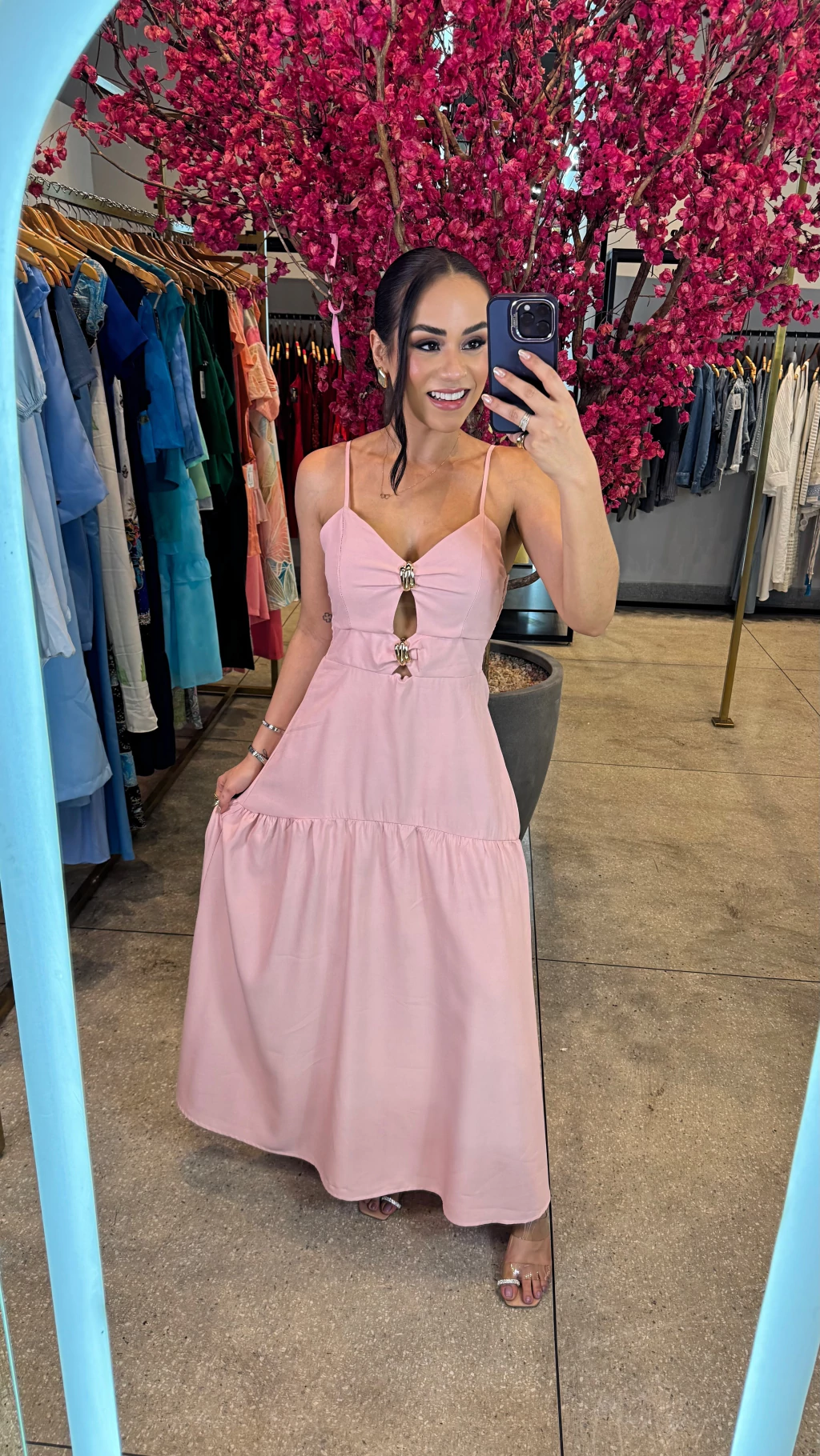 Vestido longo com elástico nas costas e regulagem detalhe com metal dourado alfaiataria marrant.