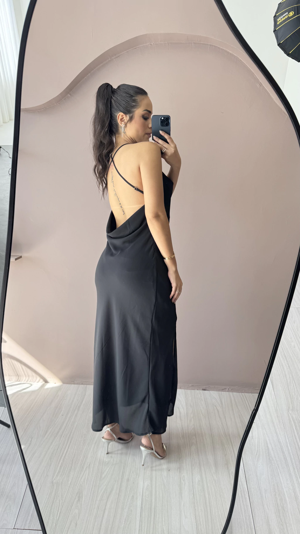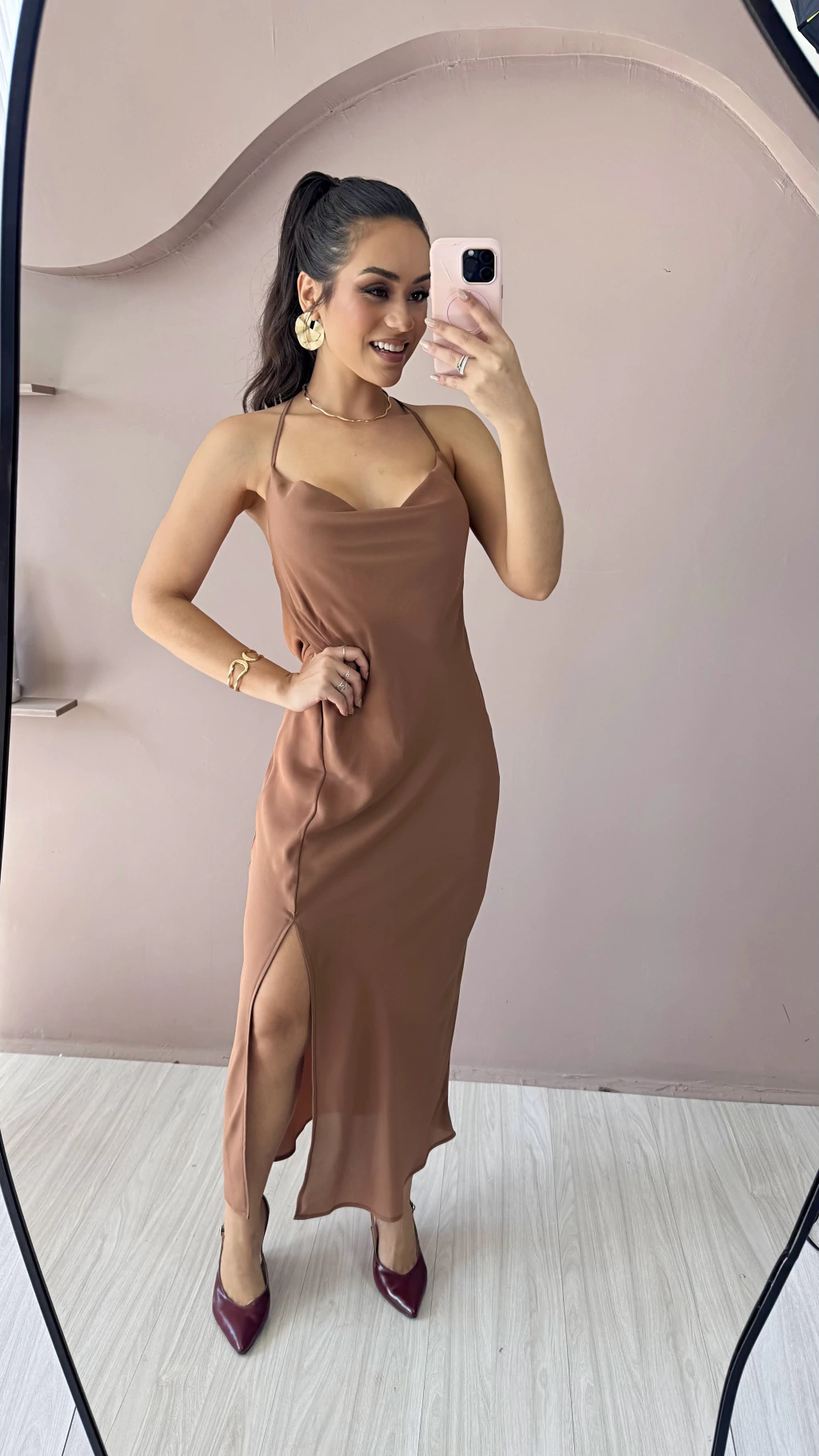 Vestido em tecido de crepe de tule forrado com alça com regulagem